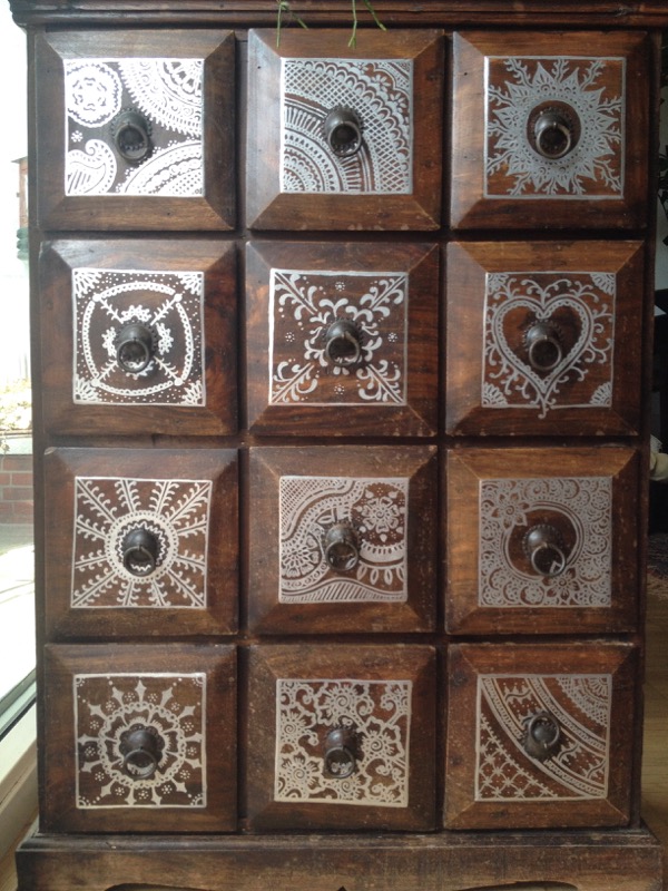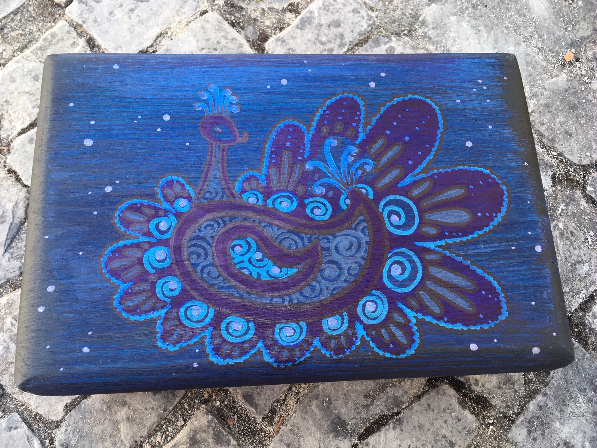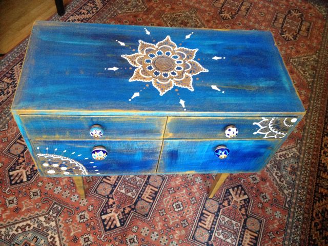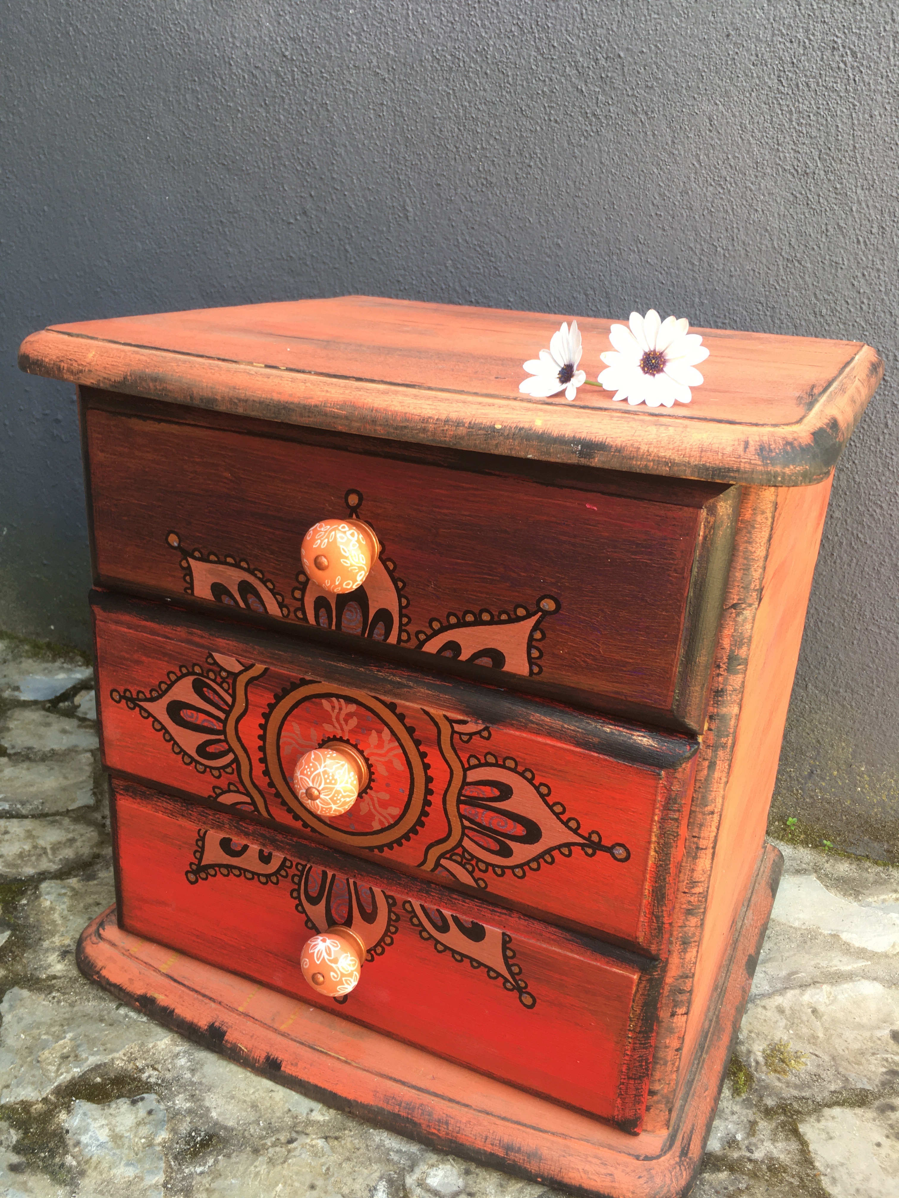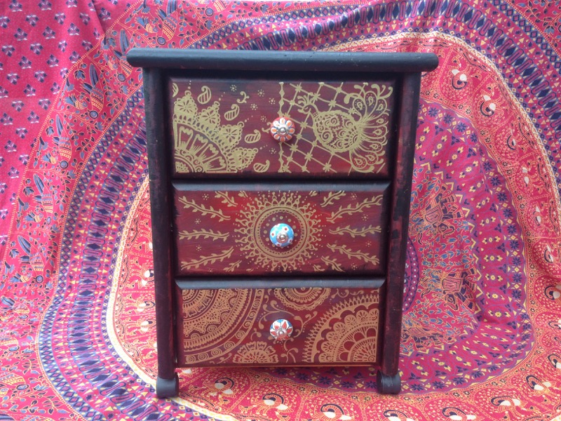 I love to paint and decorate things to make them prettier and produce individual presents. It doesn’t matter whether they are wooden boxes or books -where I can put initials or names on- (for weddings, birthdays etc.), pieces of furniture on which I create my freehand fantasy patterns or even my own handicrafted jewellery collections :)